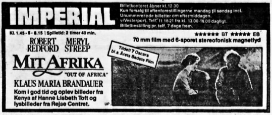 Der skulle gå næsten 13 år før den næste 70mm premiere - "Brainstorm" i april 1984. På det tidspunkt var den gamle rørforstærker fra BOFA temmelig slidt (til daglig blev lyden fra ca 1979 afviklet på en DOLBY processor og i DOLBY stereo når det var muligt med blandt andet film som "Imperiet slår igen", "Moonraker" og "USS Nimitz") og da Imperial ikke i 1984 kørte på "non-rewind" system, men kørte på begge maskiner med manuel overkørsel, var det tydeligt at der var noget galt med den ene maskines lyd. Det brummede "lystigt" i effekthøjtalerne hver gang man "kørte over" fra den ene maskine til den anden - i fulde 20 min som spolen varede. Det blev heldigvis løst rimeligt hurtigt og der var ingen problemer med hverken "2010" i 1985 eller "Mit Afrika" i 1986 - begge film blev vist med lyd fra den gamle forstærker. Efter sigende skulle instruktøren af "Mit Afrika" Sydney Pollack dog have været en smule forundret over Imperials "gamle" lydanlæg til 70mm film forevisning, idet filmen var mixet til 70mm DOLBY stereo.