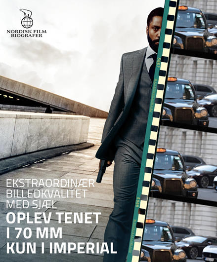 Reklame for TENET "også i 70mm" på Imperial bygningen - august 2020