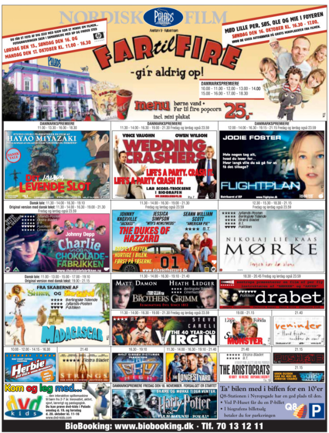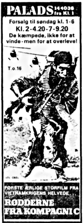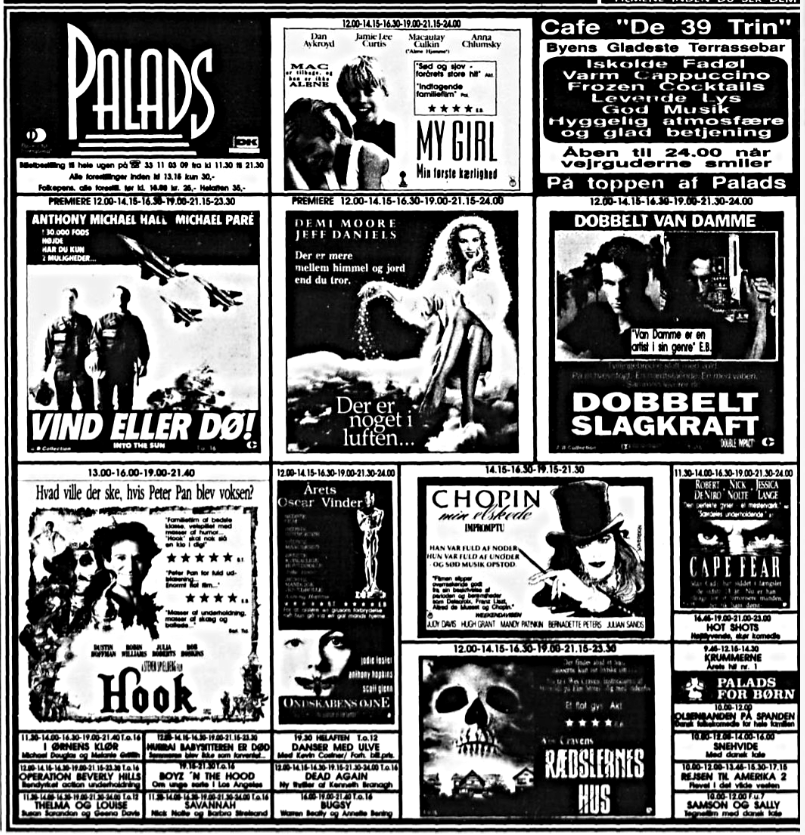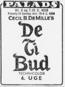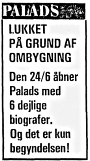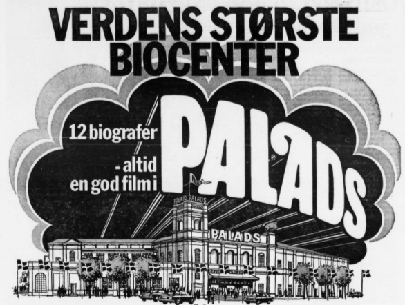 (Nordisk Film) Tlf. 7013 1211. 17 sale med i alt 2.100 sæder. Ikke til at komme udenom. Det nuværende Palads åbnede i 1918. Inden da havde den 1. Palads biograf ligget i den nedlagte banegårdshal fra Københavns 2. banegård (nedlagt i 1912), tæt på den nuværende bygning.