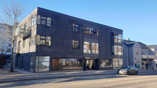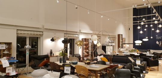 Bio Lyngby nu som møbelhus - billedet viser salen fotograferet ned mod lærredet og med de originale udgangsdøre, dog nu med glas.