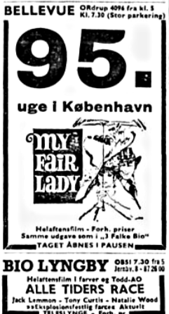 3 Falke Bio "slap" filmen den 30. august 1966, efter at have vist den siden 2. juledag 1964, kom den kopi til Husum Bio og den anden 70mm kopi (provinskopien) til Bio med lokal premiere begge steder onsdag den 31. august 1966. Begge biografer havde en meget lang annonce i avisen den dag (formentlig en 70mm annoncekliche !) Filmen spillede 4 uger for fulde huse i begge biografer. Derefter fik Bellevue "3 Falke kopien" og "provinskopien" røg tilbage til Jylland. "My Fair Lady" kom retur 11. december 1970 hvor den spillede i 2 uger og igen 17. marts 1972 hvor den spillede i 1 uge. 28. april 1980 var den igen tilbage. I oktober 1985 havde Bio repremiere på filmen som spillede i 3 uger. Den sidste gang filmen spillede var 1 uge i december 1988 til nedsatte priser, grundet kopiens tilstand. Det fremgik ikke helt tydeligt af avisannoncerne, at det var en 70mm kopi, tirsdag-torsdag var følgende dog nævnt "sidste chance, licensen udløber. 6 sporet stereolyd". 70mm kopien blev skrottet umiddelbart herefter og filmen har ikke siden været vist i danske biografer. Bio viste ikke filmen i en 35mm mono version på noget tidspunkt. Der kom underligt nok aldrig 35mm kopier med 4-sporet magnetlyd til denne film.
