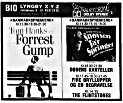 "Forrest Gump" havde danmarkspremiere den 7. oktober 1994 og blev først taget af programmet 31. august 1995. 655 forestillinger og en omsætning på ca. 1 mio kroner blev det til alene på denne film. Kopien blev så slidt, at Bio overtog kopien fra Palads i København da denne tog den af programmet.