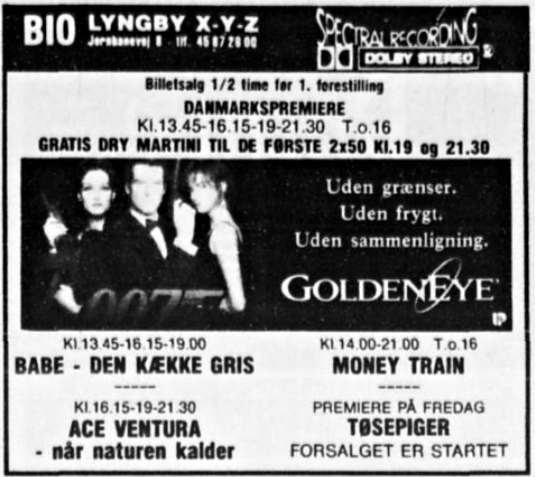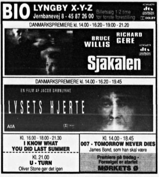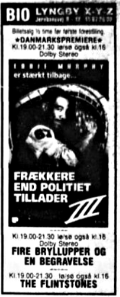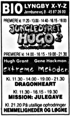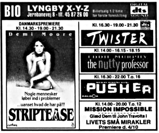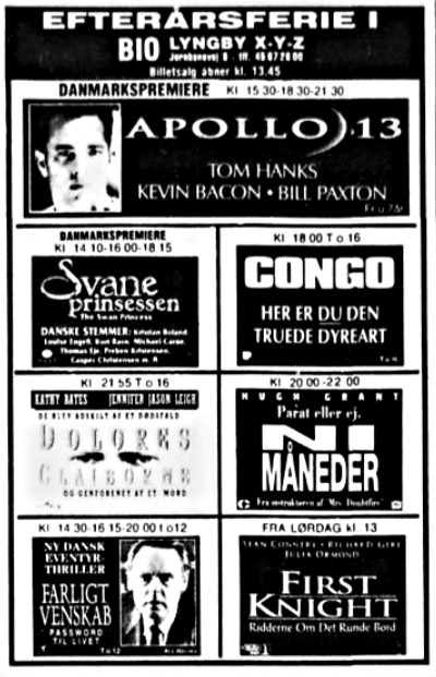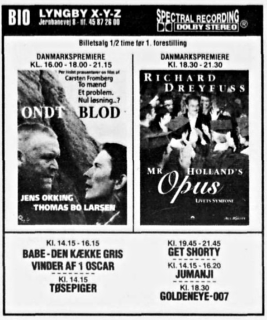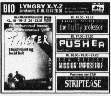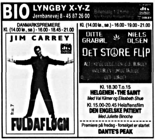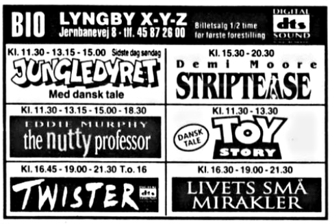 Annoncer for 1994 og 1996. Juli 1994 3 x danmarkspremiere - 2 i DOLBY og 1 i stereo. September 1996 første DTS film.