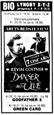 "Danser med Ulve" spillede mere end 6 måneder og var hele biografen rundt flere gange, forstået således at den havde premiere på det store lærred i sal X i maj 1991, derefter et stykke tid i de små sale inden den kom retur i august til sal X. I november fejrede filmen ½ års fødselsdag og kom til sal X for 3. gang indtil den blev pillet af programmet den 21.11.1991. I marts 1992 blev den så vist i Lyngby Teatret.