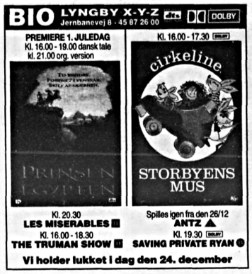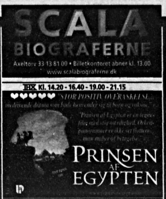 "Prinsen af Egypten" havde premiere 1. juledag 1998 i både en dansk og engelsk version - begge udgaver med DTS digitallyd. Filmen blev en stor succes - især den danske udgave. Filmen indspillede mere i Bio end i Scala Biograferne i København.