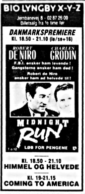 "Rain Man" med Tom Cruise og Dustin Hoffman havde premiere i marts 1989 og blev en stor succes. Filmen spillede frem til 20. juli 1989, så var der ikke plads til filmen længere.