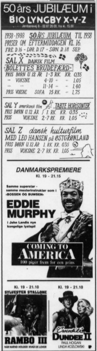 Til 50-års jubilæet i september 1988 blev der vist "gamle film" om eftermiddagen, hvorimod aftenprogrammet bestod af danmarkspremiere på "Coming til America" samt 2 tidligere danmarkspremierer som stadig spillede, "Rambo III" og "Crocodile Dundee II". Se hele programmet i bunden af denne side.