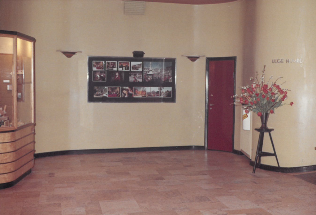 Fra åbningen i 1938 og frem til 1988, var indretningen af foyeren meget stringent. Som det ses på venstre billede ovenfor var der ikke mange siddepladser i foyeren. Kun mellem de 2 indgangsdøre under det store maleri var der en lang "sofa". Omvendt var der tit 600 mennesker i foyeren blandt andet i pausen ved en helaftensfilm, det krævede en del plads.