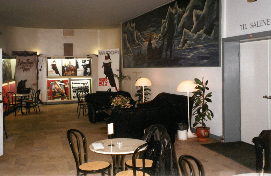 Biografens foyer 1965 og 1993. I 1992 blev der etableret cafe i foyeren og i 1993 fik biografen EDB-billetsalg