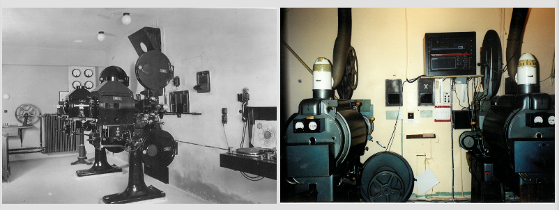 Operatørrummet i 1938 med AEG-anlæg og i 1998 med italienske Victoria 8 35/70mm maskiner