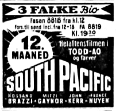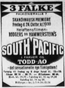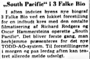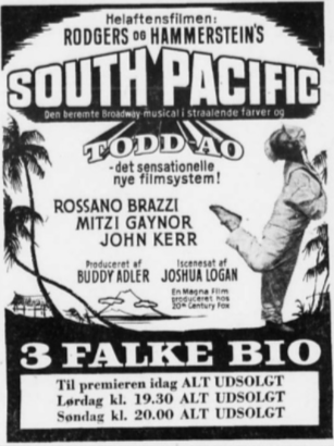 3 Falke Bio viste åbningsfilmen "South Pacific" i flere år og med samme 70mm kopi som biografen selv holdt vedlige. Biografen var ved åbningen, som tidligere nævnt, den eneste biograf i Skandinavien som kunne vise 70mm film, så publikum kom både fra det øvrige Danmark samt fra Sverige. 12. august 1967 havde filmen re-premiere i 3 Falke Bio og denne gang var 70mm kopien helt ny.