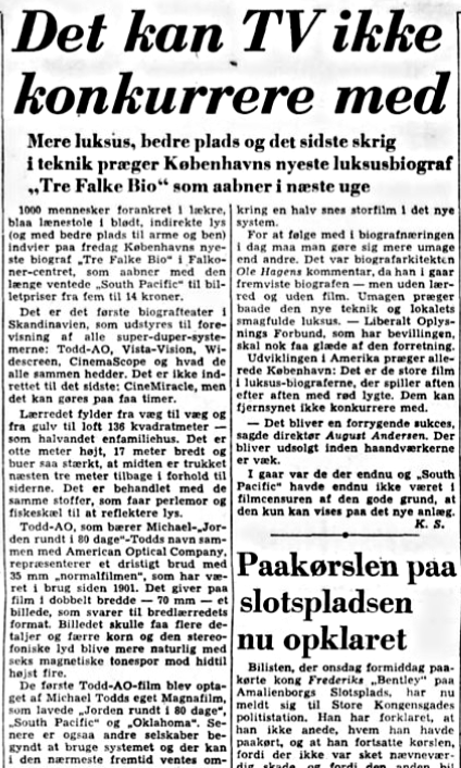 Biografen åbnede som beskrevet andet steds på disse sider, i oktober 1958 med filmen "SOUTH PACIFIC" i 70mm Todd-AO 6-kanals stereofonisk magnetlyd. Biografen var den første i Skandinavien som kunne vise 70mm film - faktisk var den bygget til formålet. Det var Europas 4. 70mm biograf efter Rom (1957), Hamburg (1957) og London (april 1958). (I Danmark åbnede Europa Bio i Aalborg og Kinopalæet (nr.3) i december 1959 som 2. og 3. 70mm biograf. Palladium ombyggede biografen i 1960 til 70mm og i 1961 kom Imperial Bio så til.)