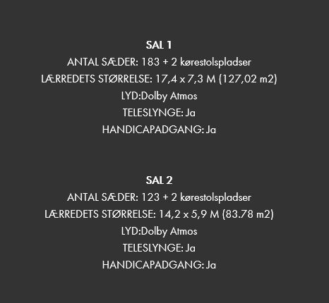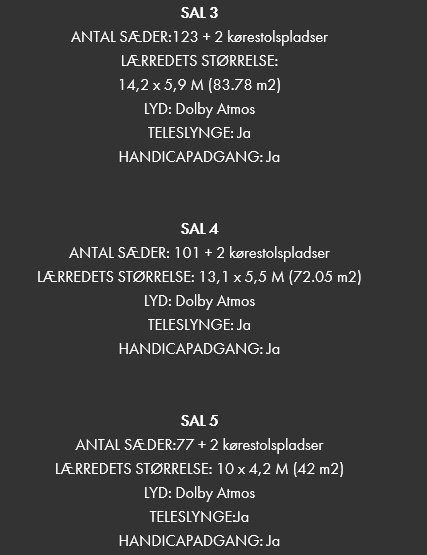Der er 5 sale i komplekset fra 77-183 pladser, alle udstyret med DOLBY Atmos lyd og recliners. Der er tillige kørestols-pladser i alle salene.